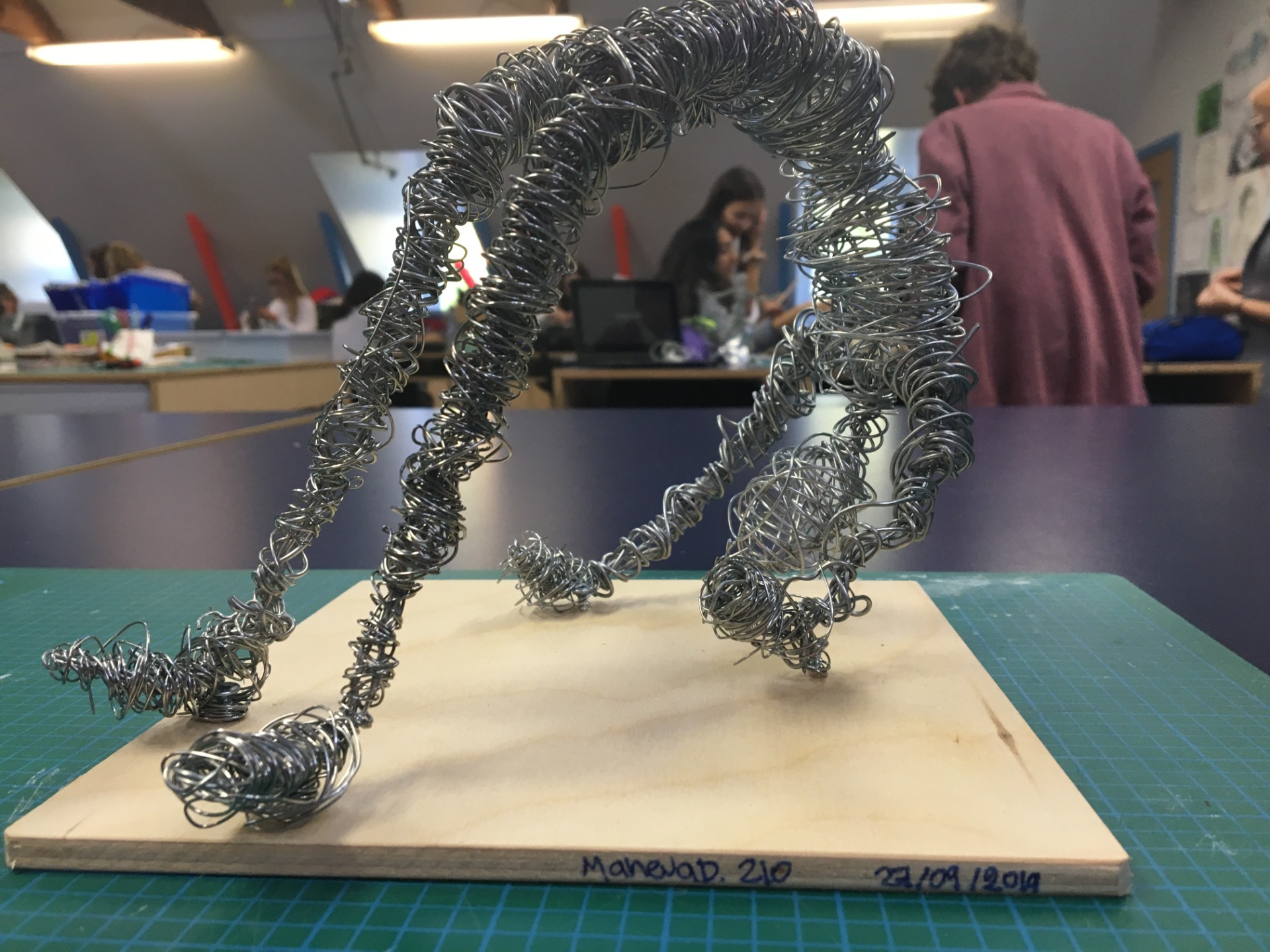 Le fil épais du début était difficile a manipuler et ça m'a laissé pleins d'égratignure malheureusement. Également, pendant certains cours nous manquions de fil. Et après, le nouveau fil était très mince donc comme je n'avais pas encore fait la jambe gauche, pour l'équilibrer j'ai du mettre plusieurs couches.