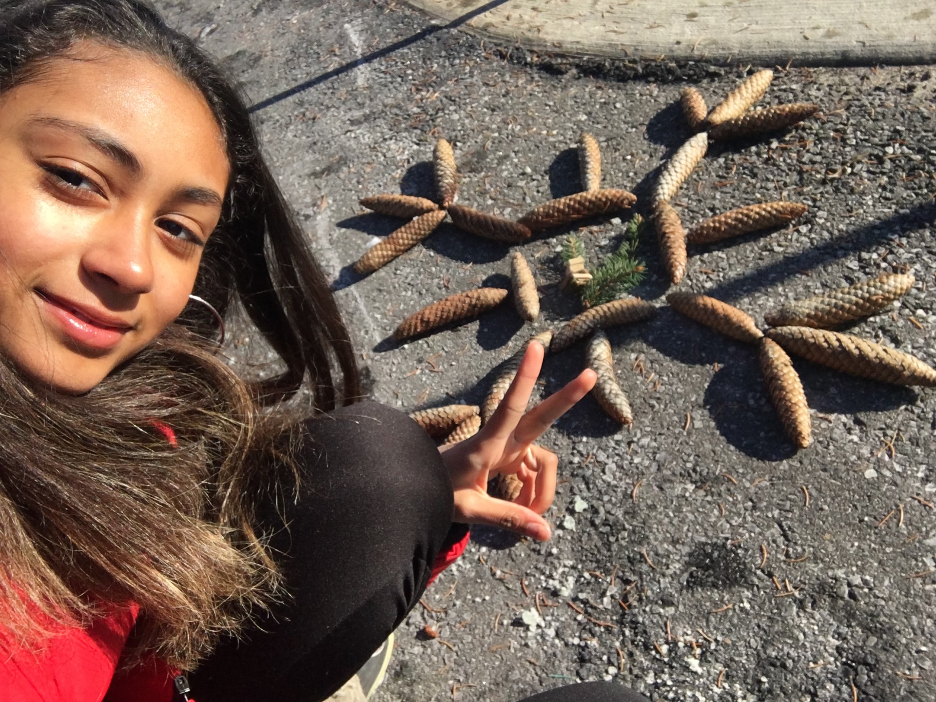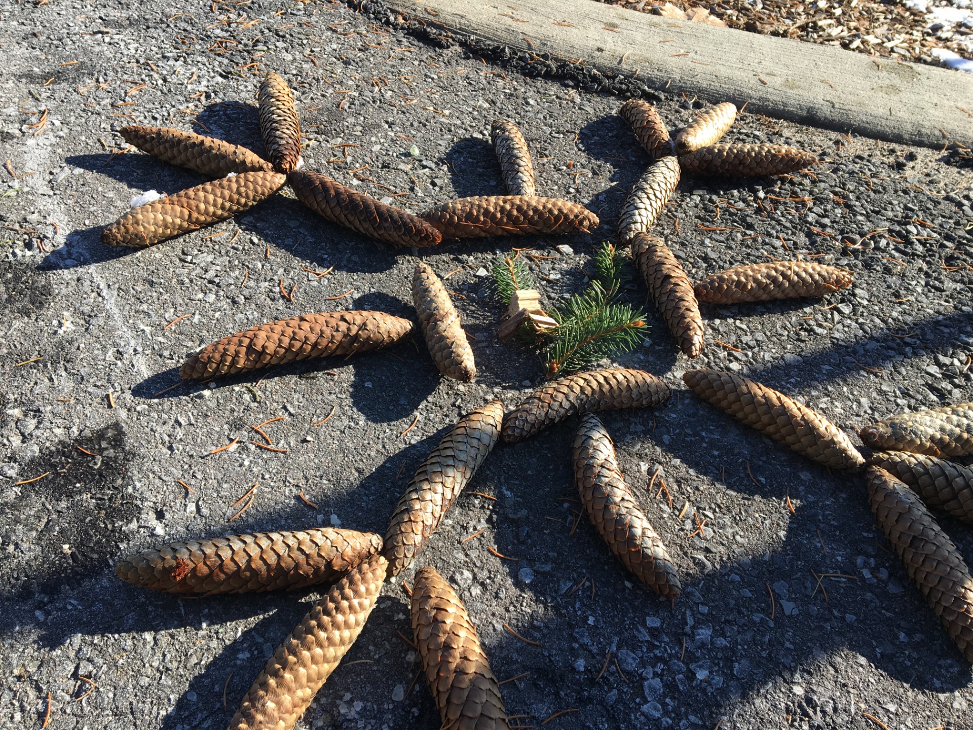J’ai fait un flocon avec du gui en son milieu. Je voulais représenter Noël qui arrive à grands pas, mais sans neige pour l’instant. C’est pourquoi j’ai utilisé des pommes de pin pour former mon flocon. Pour représenter cette période des fêtes sous les derniers rayons d’automne. Comme lieu public, je l’ai fait dans un parc près de chez moi.